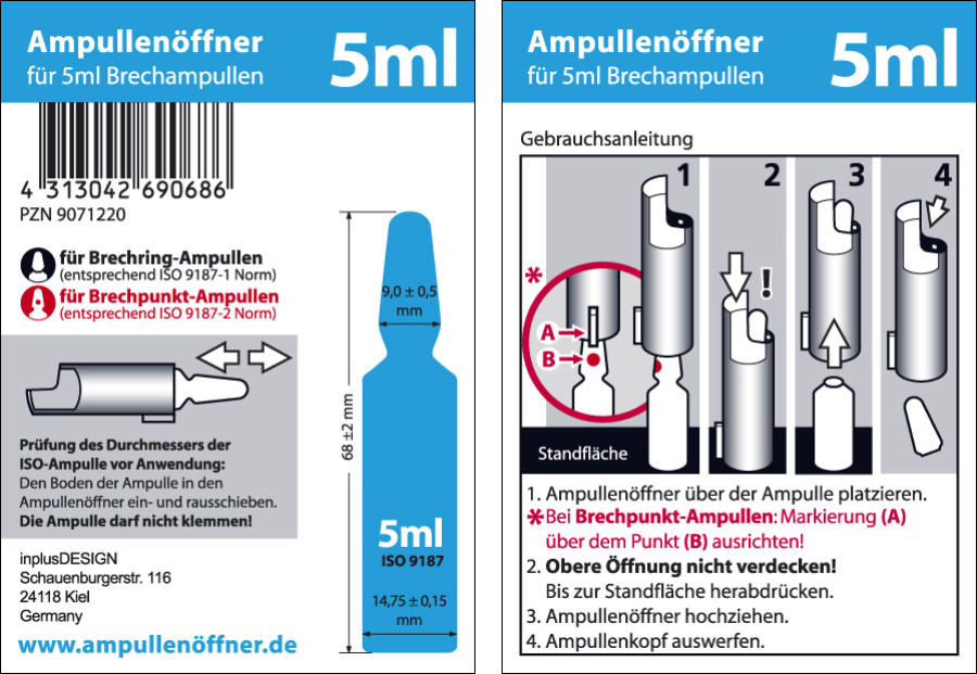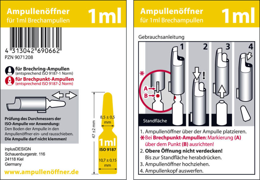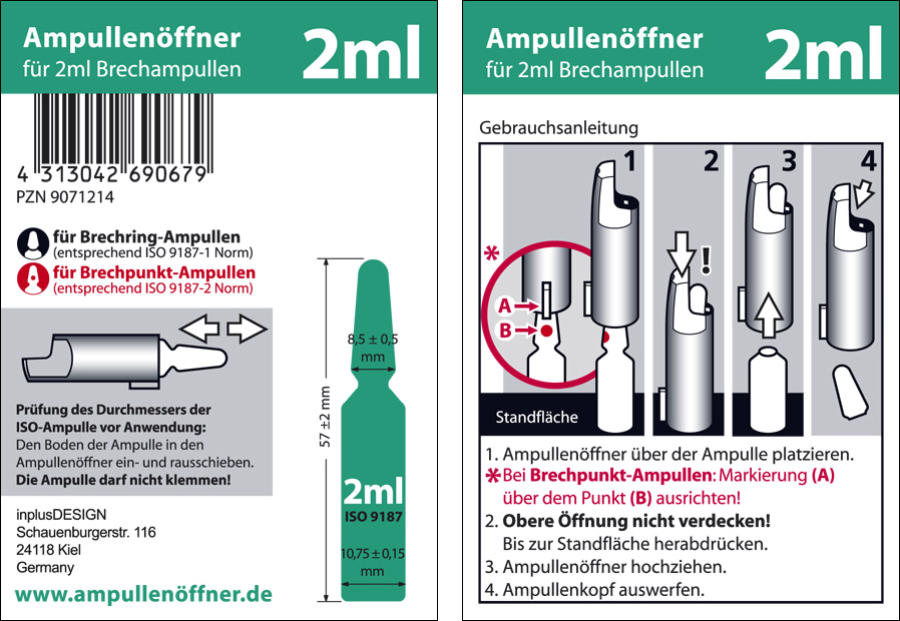 Ampullenöffner für 1 ml Ampullen. Gebrauchsanleitung. Ampullenöffner für 2 ml Ampullen. Gebrauchsanleitung. Ampullenöffner für 5 ml Ampullen. Gebrauchsanleitung. Ampullenöffner für 20 ml Ampullen. Gebrauchsanleitung.
